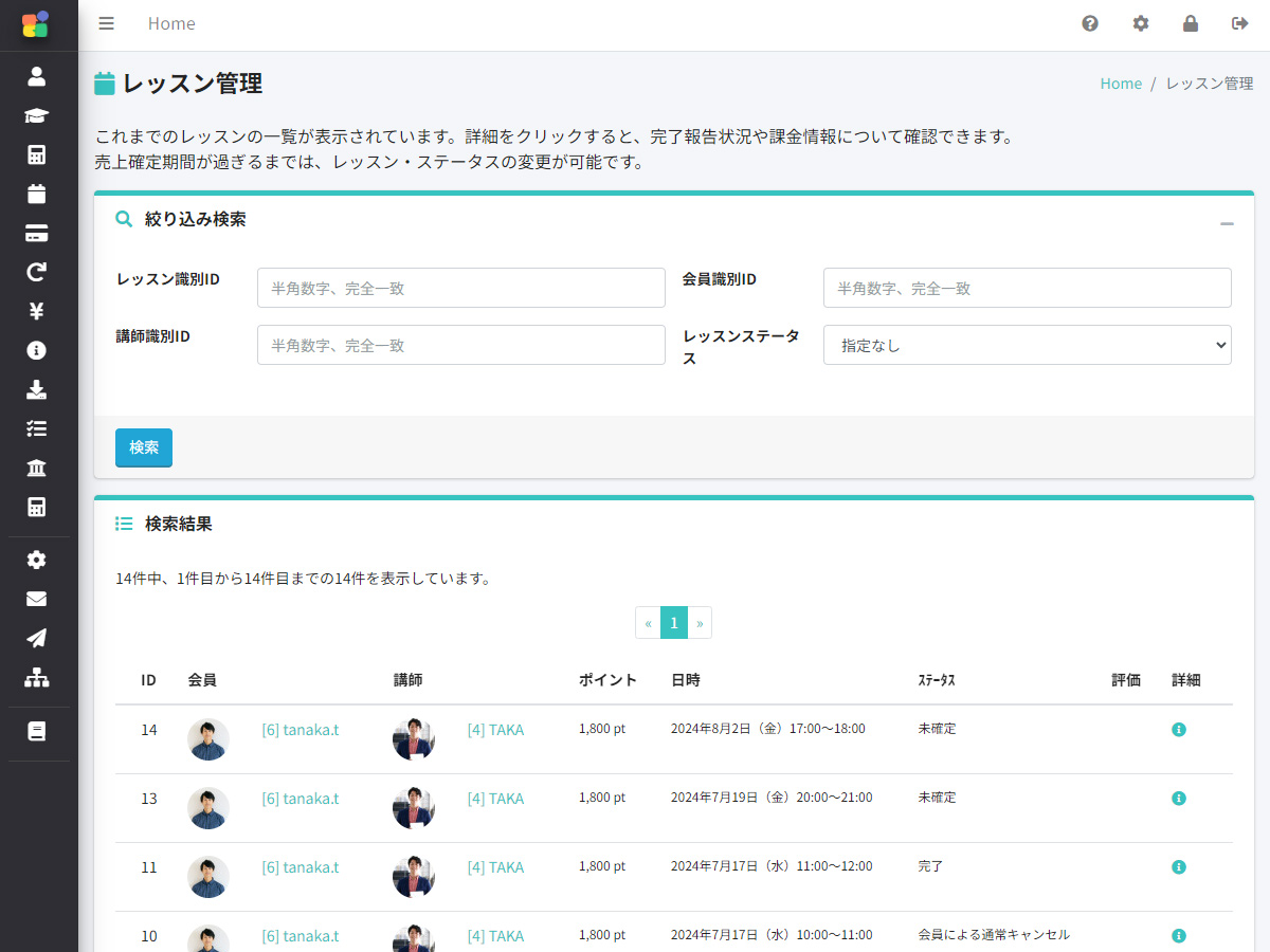 予約、キャンセル、レッスン履歴、月謝・チケット管理、請求作業までを一元化。